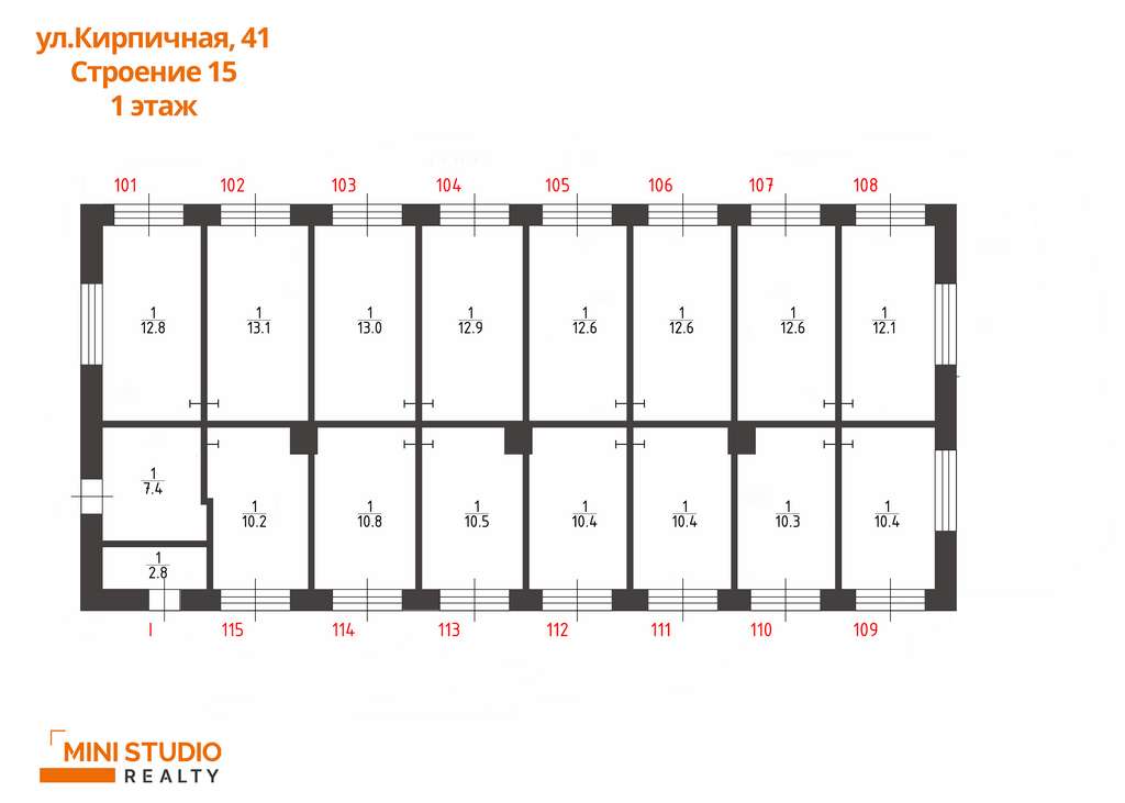 Помещение располагаются в 1-этажном бизнес-квартале Кирпичная 41 корп 15 (лот 109 на плане) . Подойдут под торговую точку, интернет-магазин, склад.