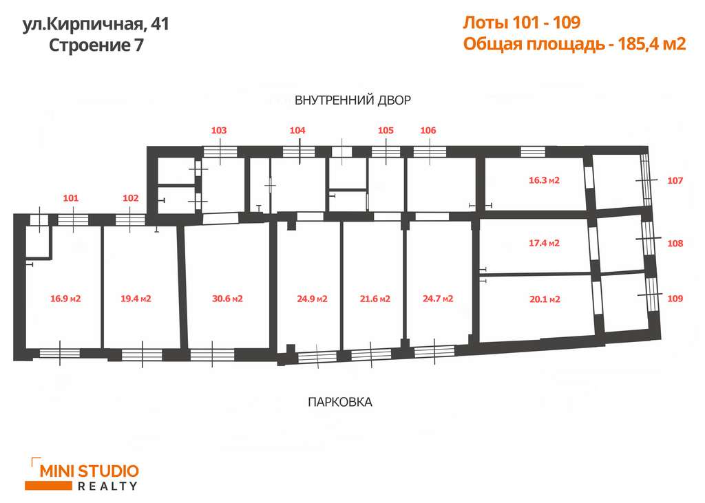 Здание разделено на 9 отдельных лотов под чистовую отделку от 16 - 30 кв. м с отдельными входами.
