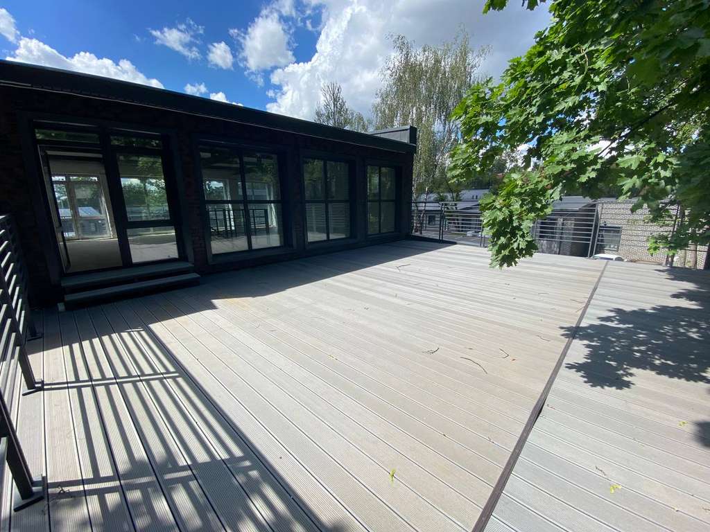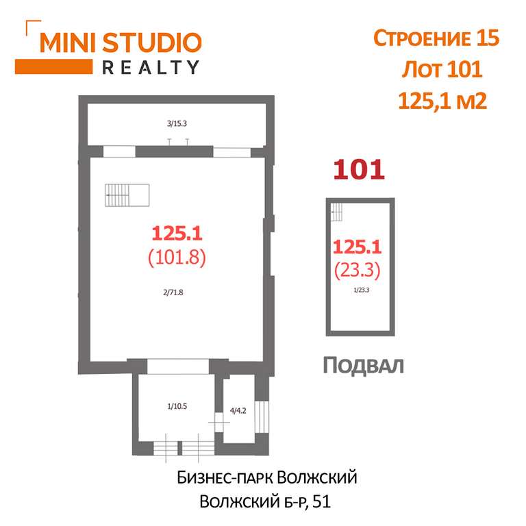 В площадь 125,1 кв. м. входит первый этаж (101,8кв. м) и подвальное помещение (23,3). Патио (примерно 60 кв. м) и разборная антресоль (примерно 40 кв. м) являются приятным бонусом к приобретаемому помещению.
