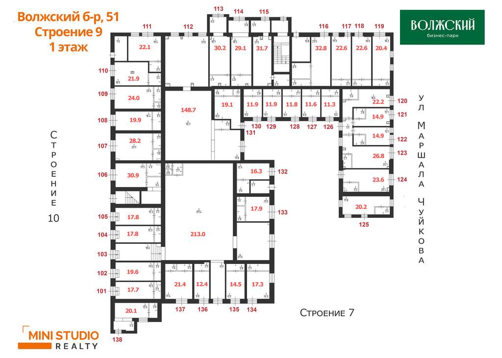 Продается блок из 2-х помещений свободного назначения с отдельным входом 59,3 кв. м на 1 и втором этаже в Бизнес-парке Волжский. На плане лот 132 + второй этаж 43 кв. м.