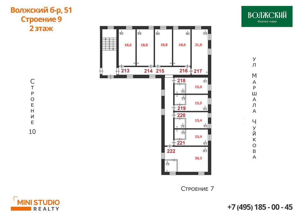 Продается помещение под офис 21,8 кв. м на 2 этаже в Бизнес-парке Волжский (лот 217 на плане) .