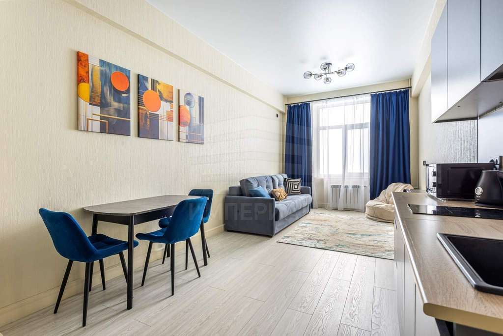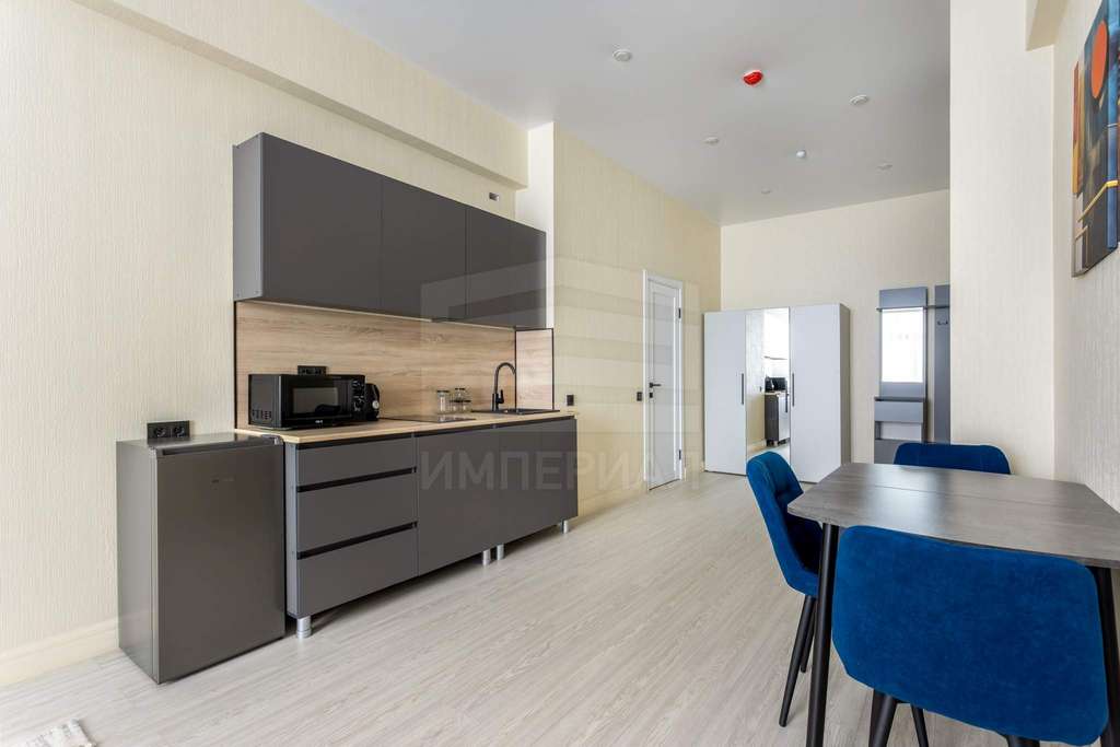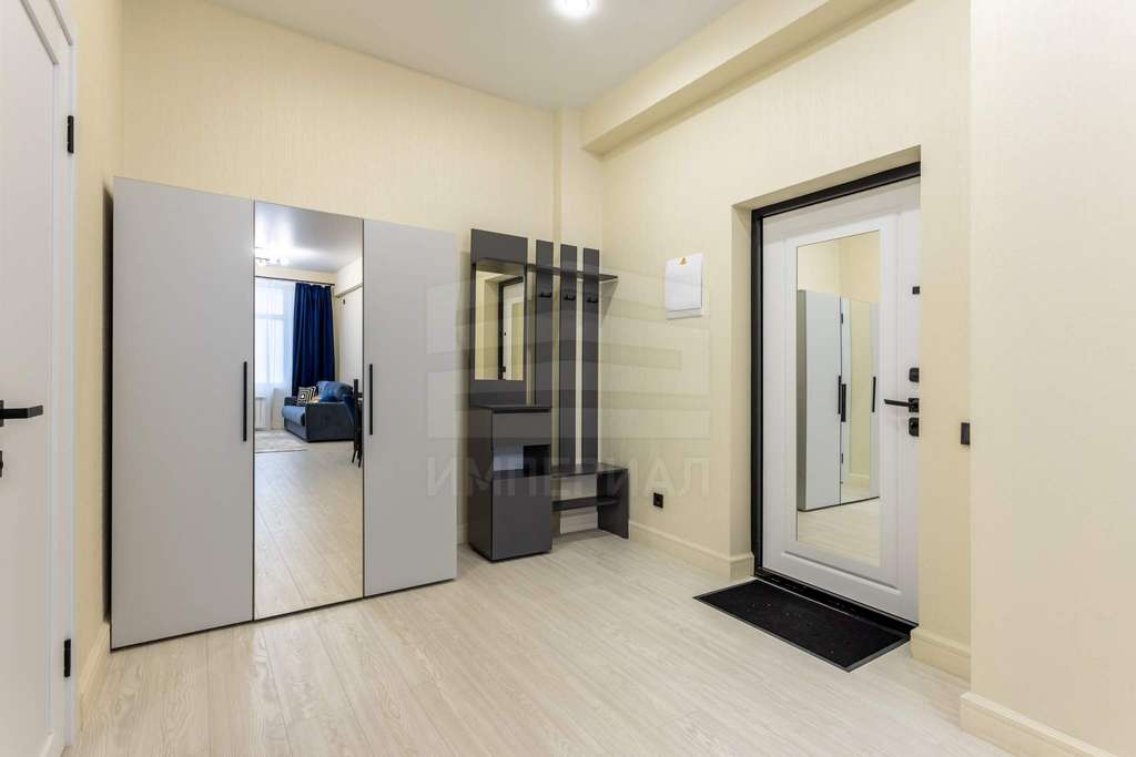 На полу постелен ламинат, на стенах поклеены светлые обои, полностью мебелированный.