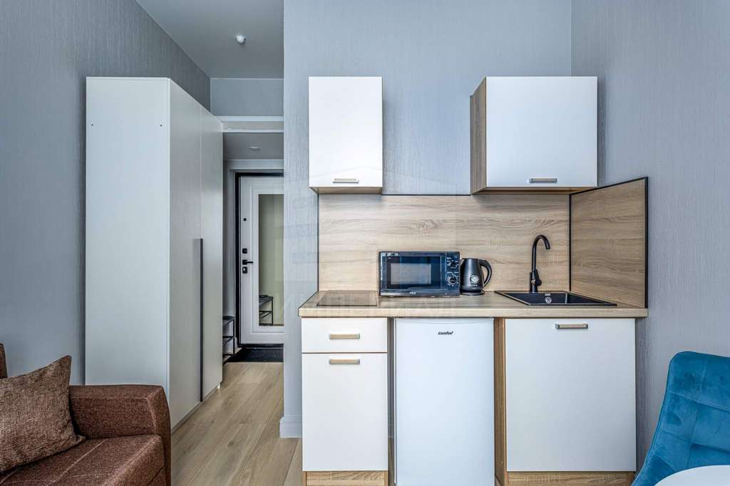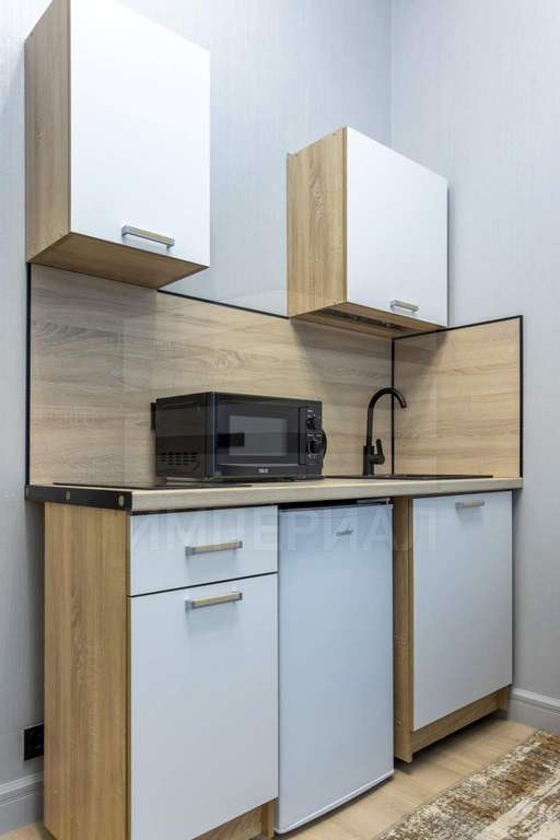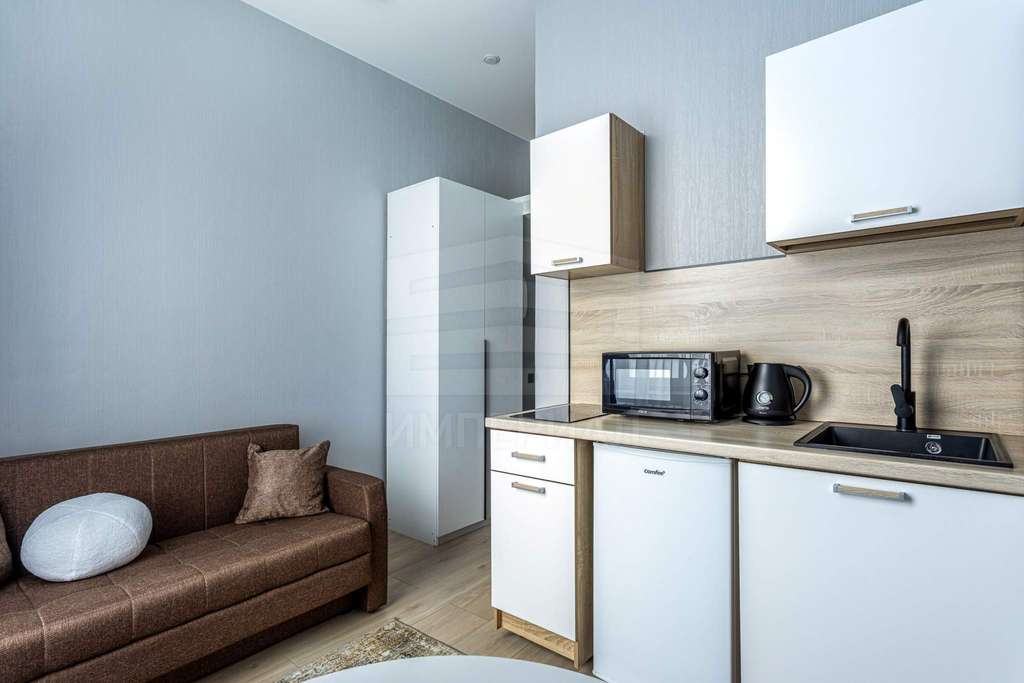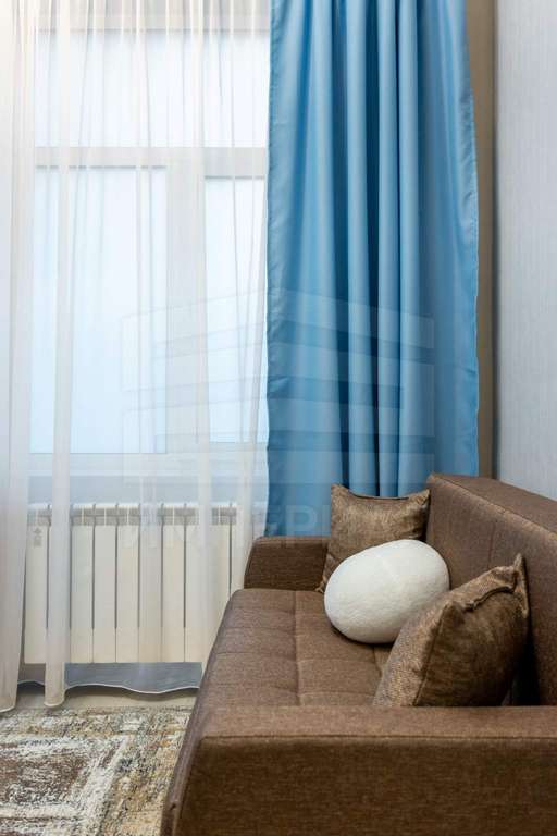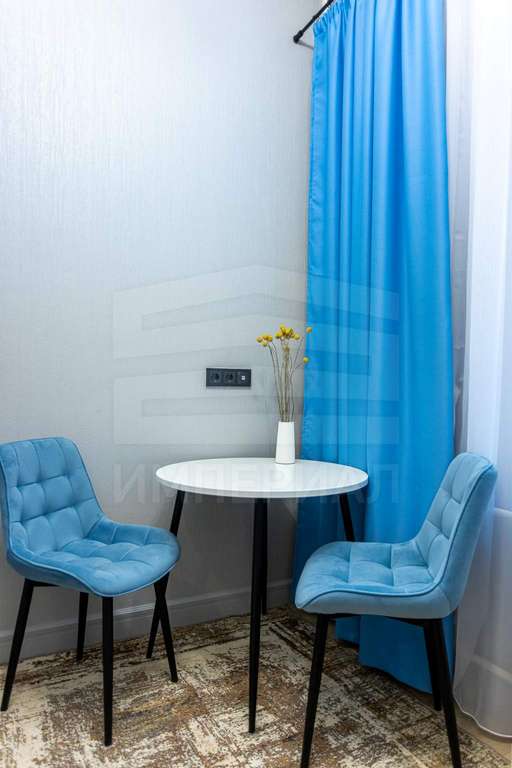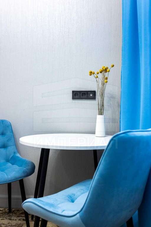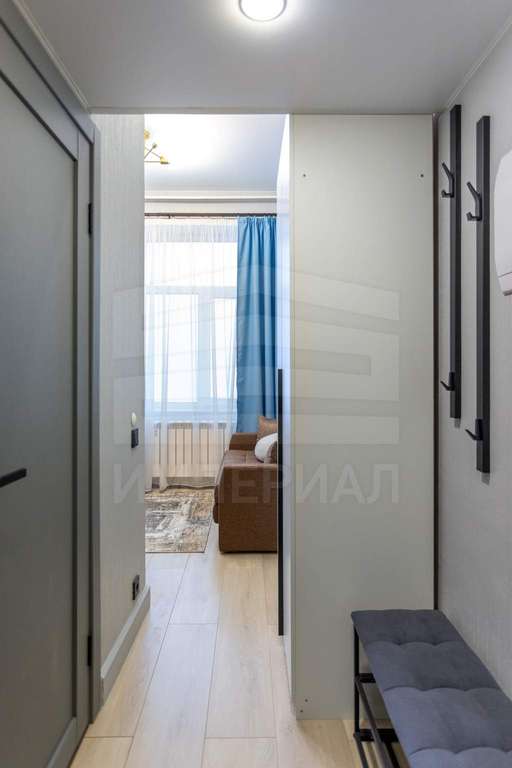 На полу постелен ламинат, на стенах поклеены светлые обои, полностью мебелированный.