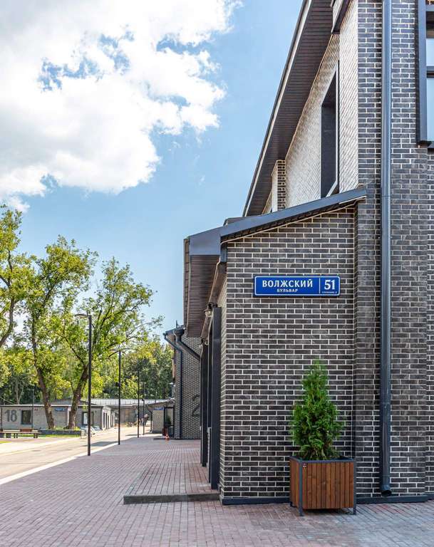 Отделка фасадов выполнена панелями с имитацией клинкерного кирпича. Дополнительно на территории организованы зоны отдыха, также дополнительно имеется возможность для организации летних веранд и кафе.