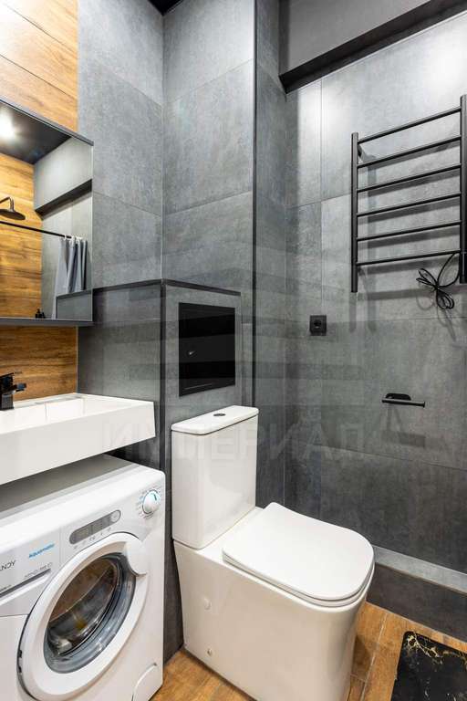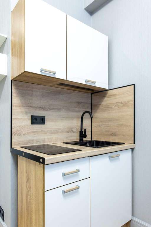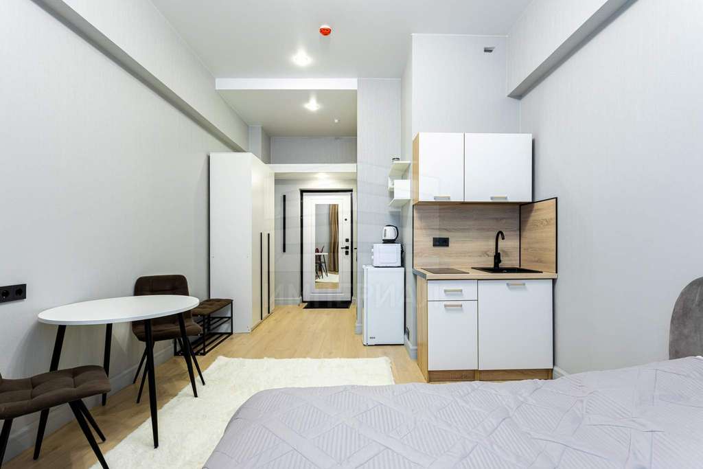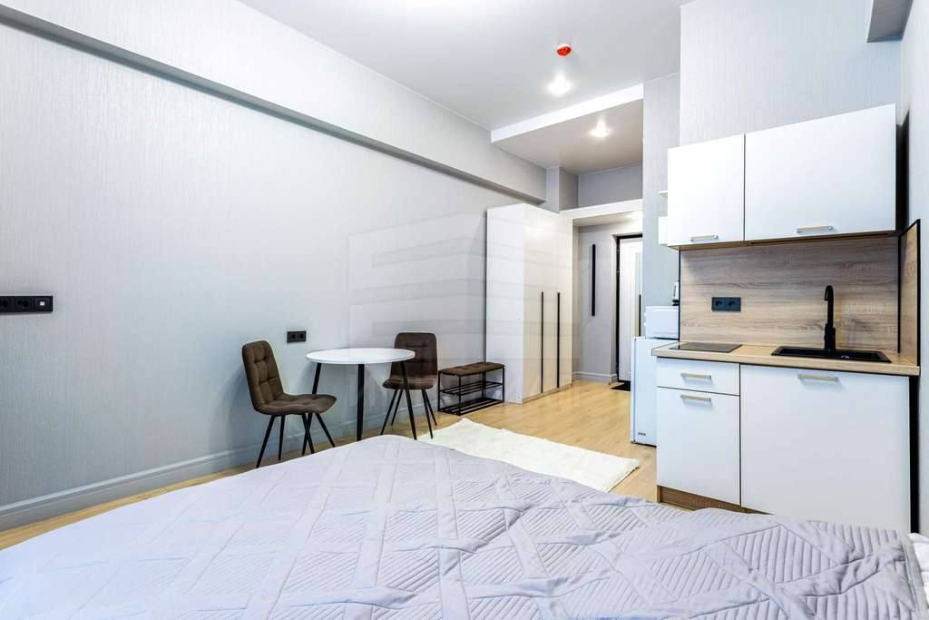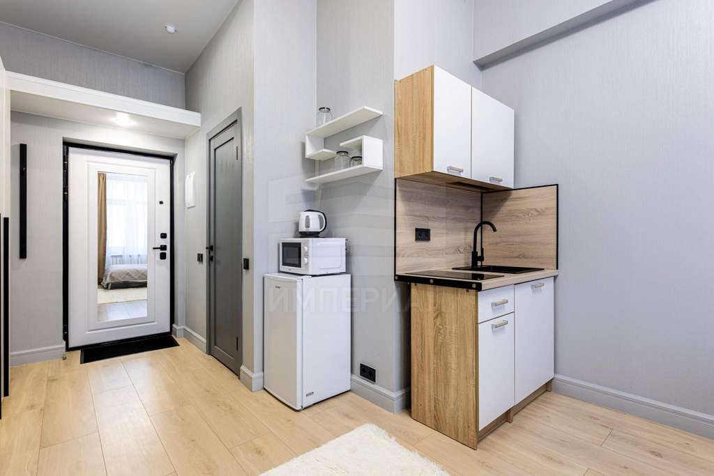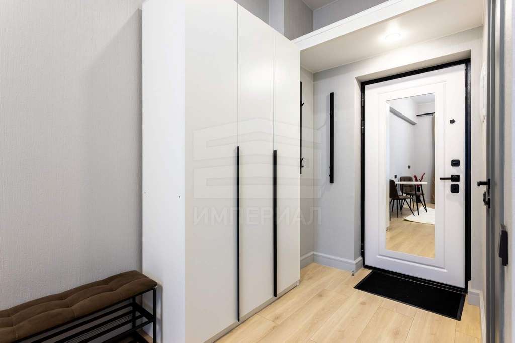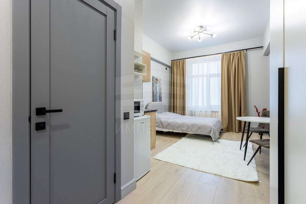 На полу постелен ламинат, на стенах поклеены светлые обои, полностью мебелированный.