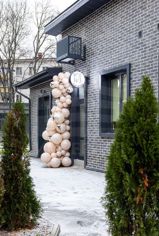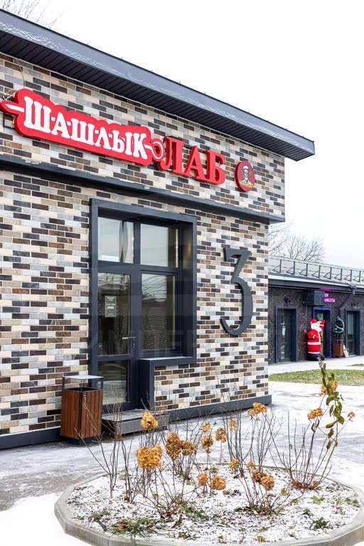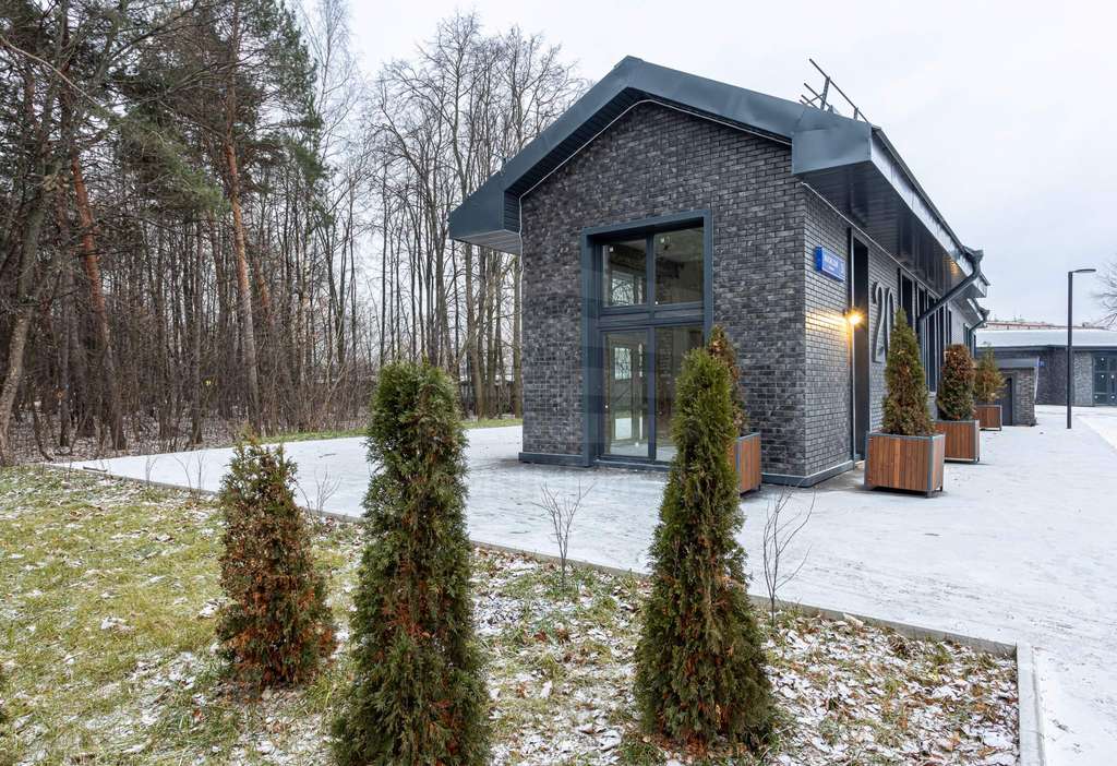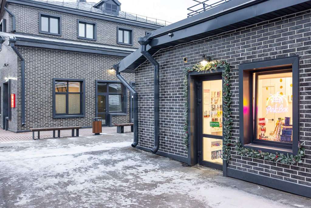 Отделка фасадов выполнена панелями с имитацией клинкерного кирпича. Дополнительно на территории организованы зоны отдыха, также дополнительно имеется возможность для организации летних веранд и кафе.