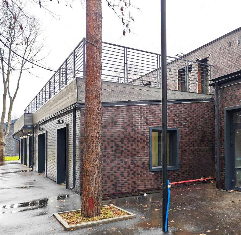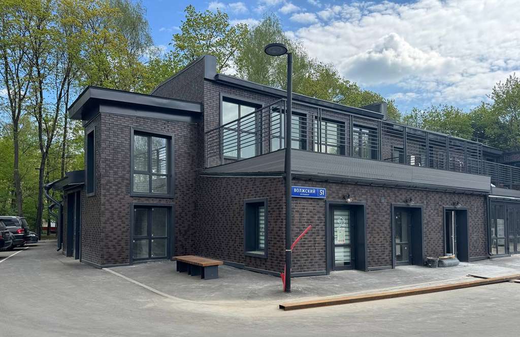 Отделка фасадов выполнена панелями с имитацией клинкерного кирпича. Дополнительно на территории организованы зоны отдыха, имеется возможность для организации летних веранд и кафе.