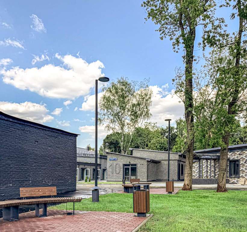 Отделка фасадов выполнена панелями с имитацией клинкерного кирпича. Дополнительно на территории организованы зоны отдыха, дополнительно имеется возможность для организации летних веранд и кафе.