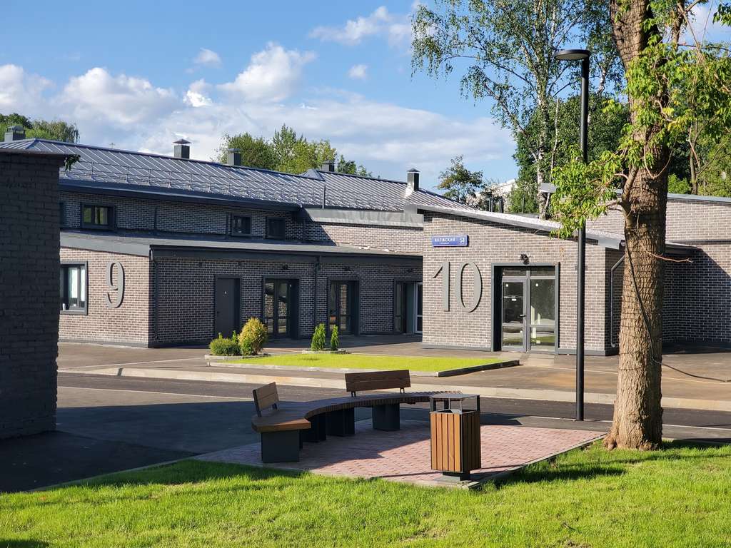 Отделка фасадов выполнена панелями с имитацией клинкерного кирпича. Дополнительно на территории организованы зоны отдыха на свежем воздухе, также дополнительно имеется возможность для организации летних веранд и кафе.