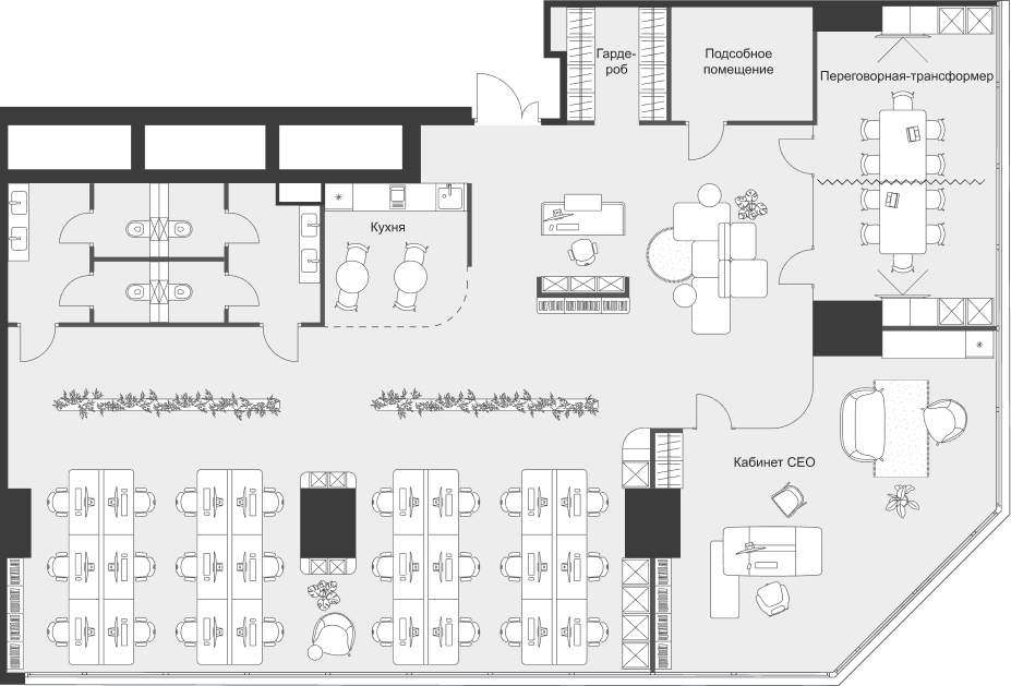 - Пространства без колонн в углах, идеально подходят для руководителей и современных команд.