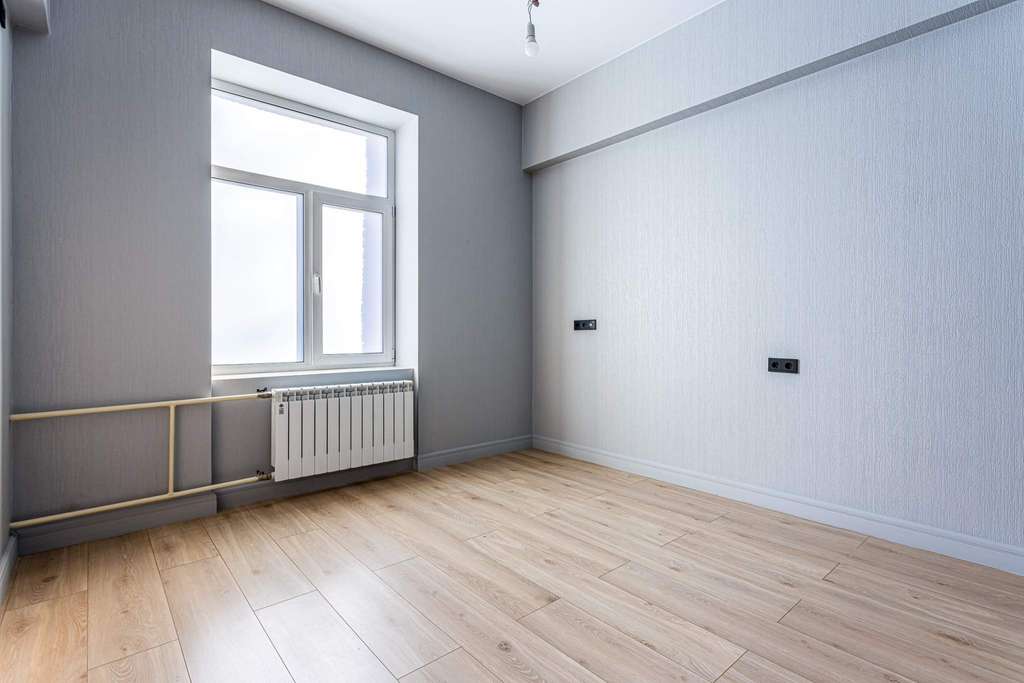 На полу постелен ламинат, на стенах поклеены светлые обои.