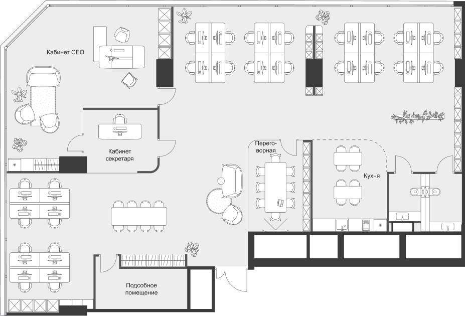 - Пространства без колонн в углах, идеально подходят для руководителей и современных команд.