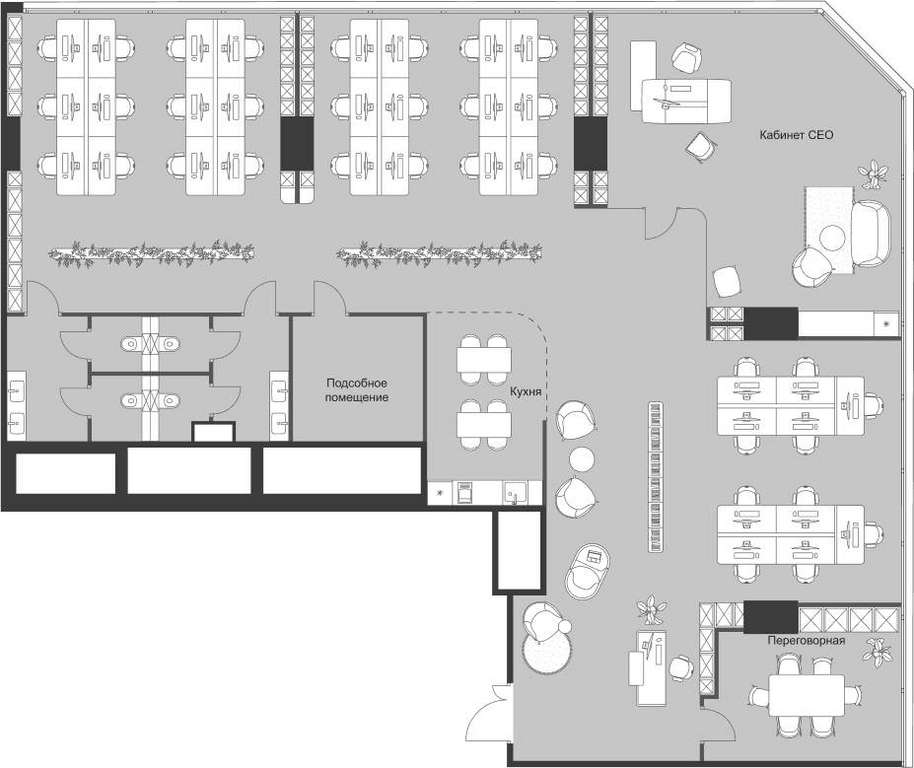 - Пространства без колонн в углах, идеально подходят для руководителей и современных команд.