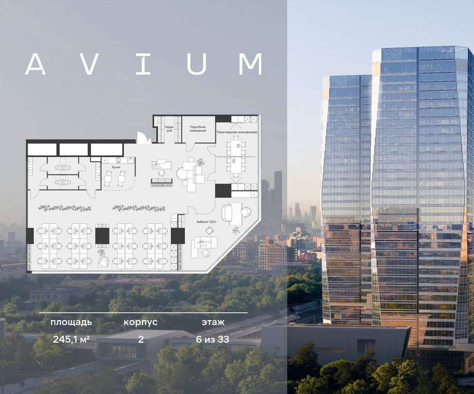 Продажа премиальных офисов в бизнес центре AVIUM. Две 34-этажные башни, объединённые галереей и дочерним корпусом.