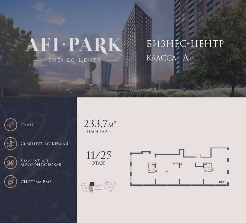 Продается просторное коммерческое помещение общей площадью 233,7 на 11 этаже в готовом бизнес-центре AFI Park. Строительство комплекса завершено.