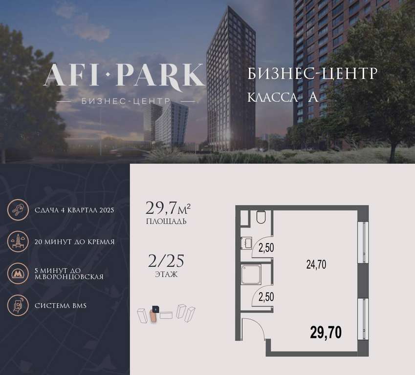 Продается просторное коммерческое помещение общей площадью 29,7 м2 на 2 этаже в строящемся бизнес-центре AFI Park.