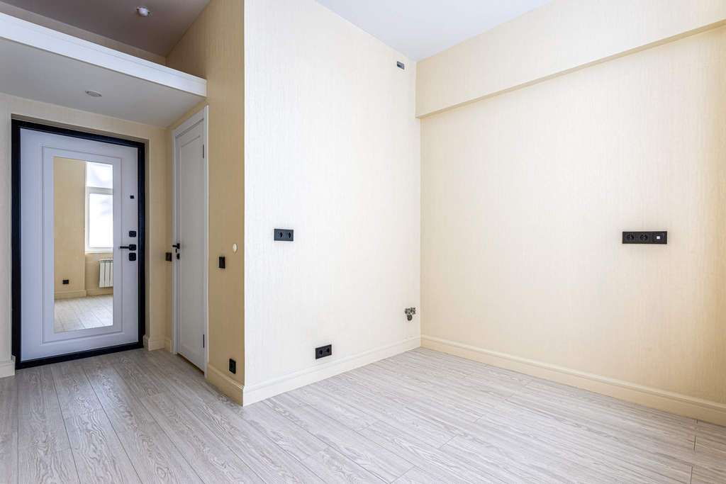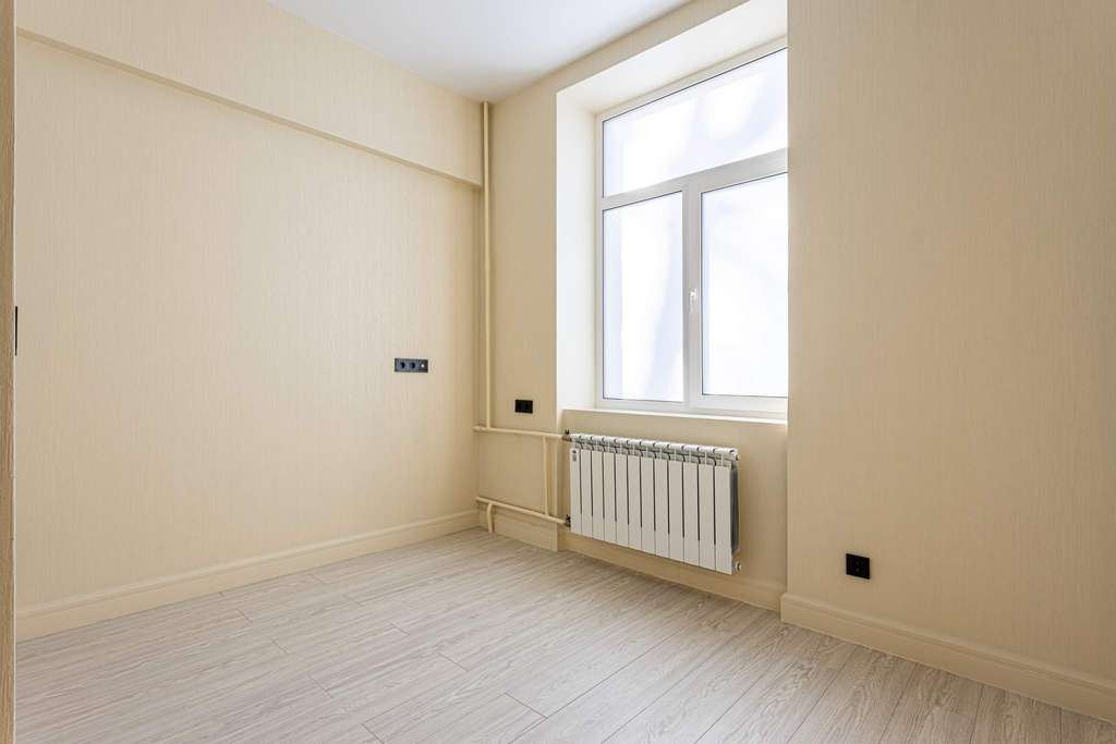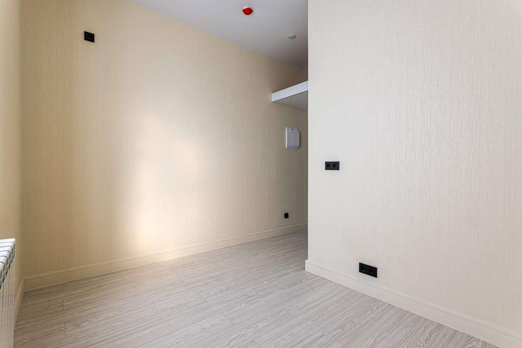 На полу постелен ламинат, на стенах поклеены светлые обои.