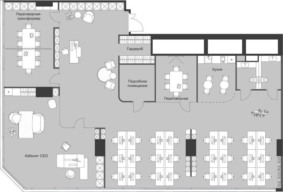 - Пространства без колонн в углах, идеально подходят для руководителей и современных команд.