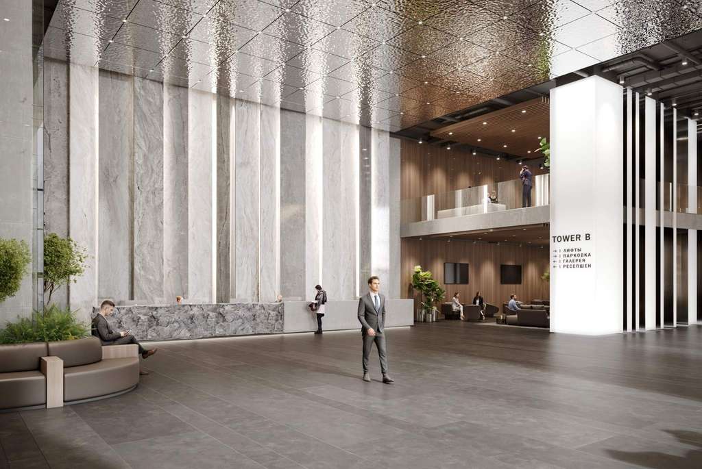 Гранд-лобби 1500 м, высота 9 м - знаковое пространство с интерьерами от бюро UNK corporate interiors.