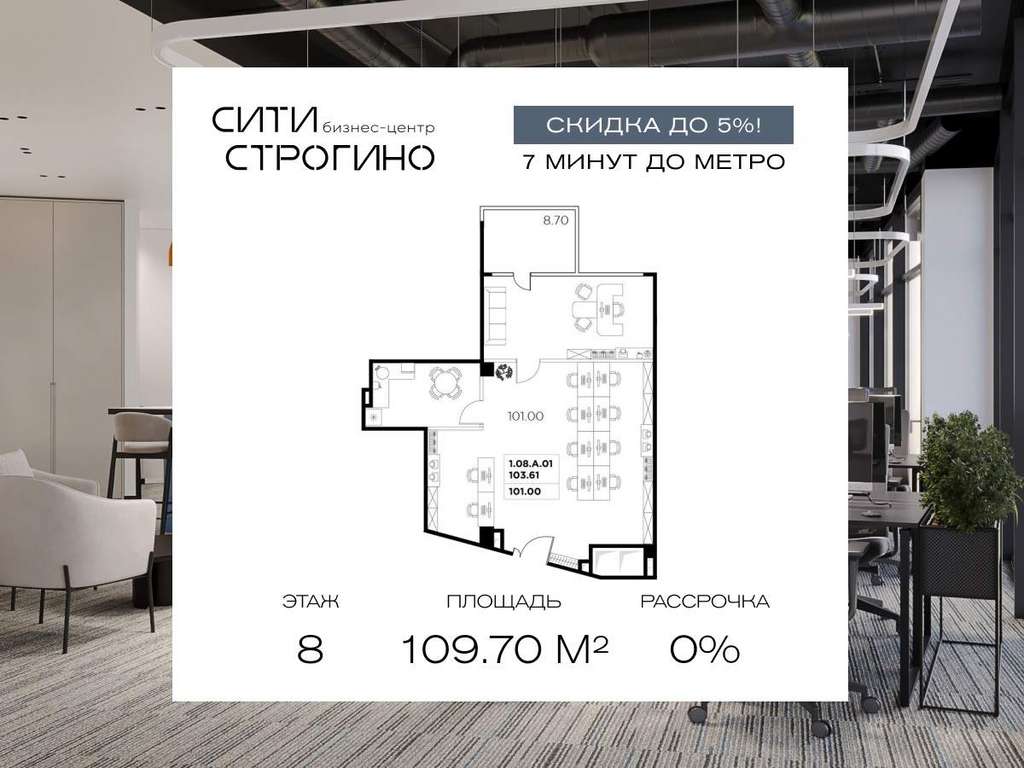 В продаже от застройщика комфортабельный Private-офис площадью 109.7 м на 8 этаже в премиальном бизнес-центре Сити Строгино. Срок сдачи - 2028 год.