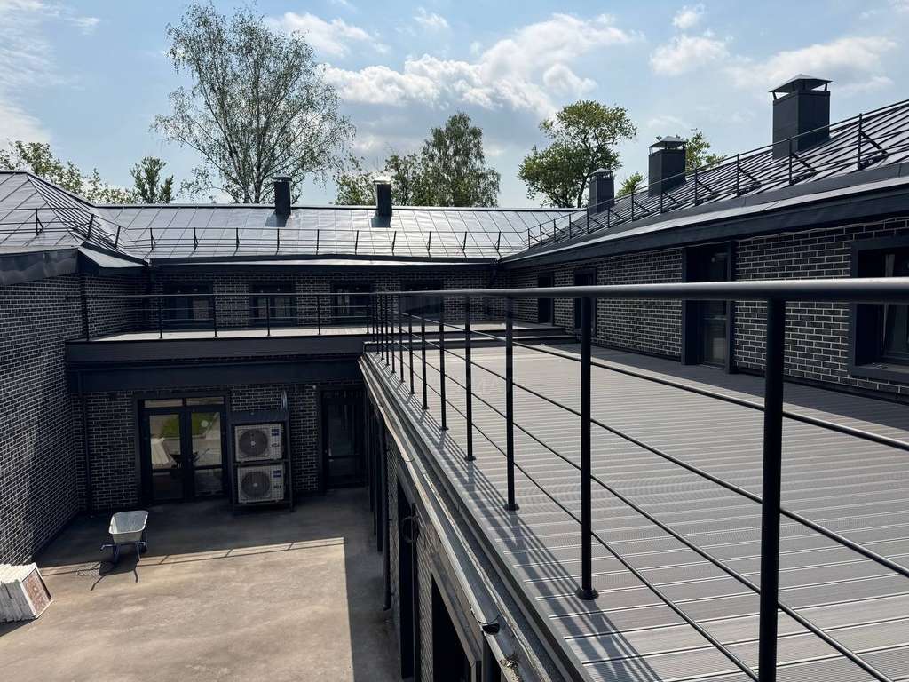 Отделка фасадов выполнена панелями с имитацией клинкерного кирпича. Дополнительно на территории организованы зоны отдыха, имеется возможность для организации летних веранд и кафе.