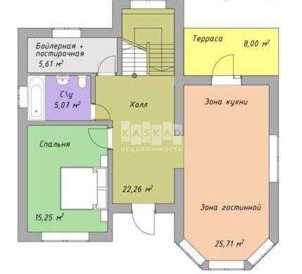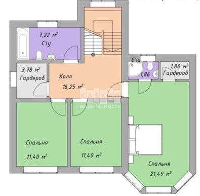 1 этаж: холл, кухня-гостиная с выходом на веранду, спальня, санузел, бойлерная; 2 этаж: 3 спальни, 2 санузла, 2 гардеробные;