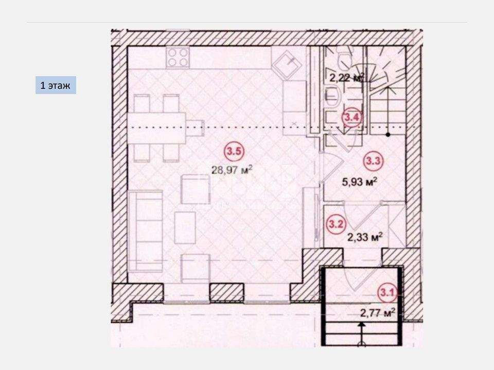 1 этаж: Большая гостиная с кухонной зоной, санузел, прихожая;