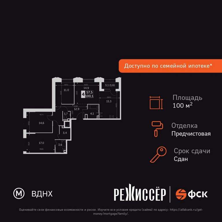 Жилая площадь 57.5 кв. м, кухня 15.3 кв. м, ремонта нет, окна выходят на улицу.