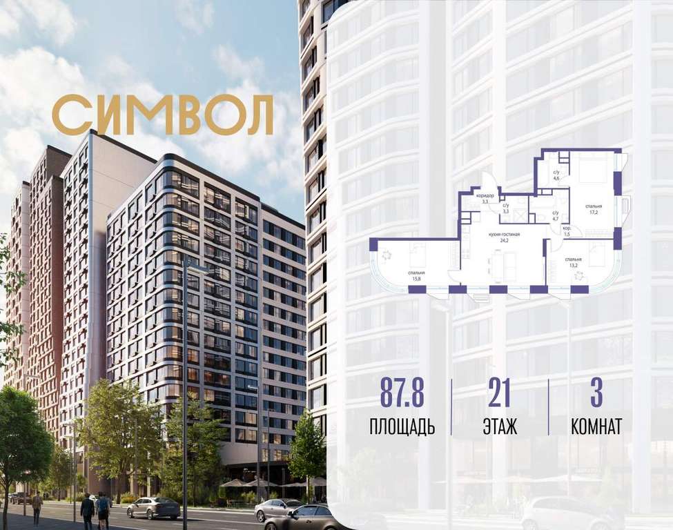 Продается 3-комнатная квартира от застройщика: общая площадь 87.80 м, жилая 46.20 м, кухня 24.20 м, 21-й этаж, жилой квартал «Гордость», корпус 36 (секция 1) . Срок сдачи: 2 квартал 2029 года.