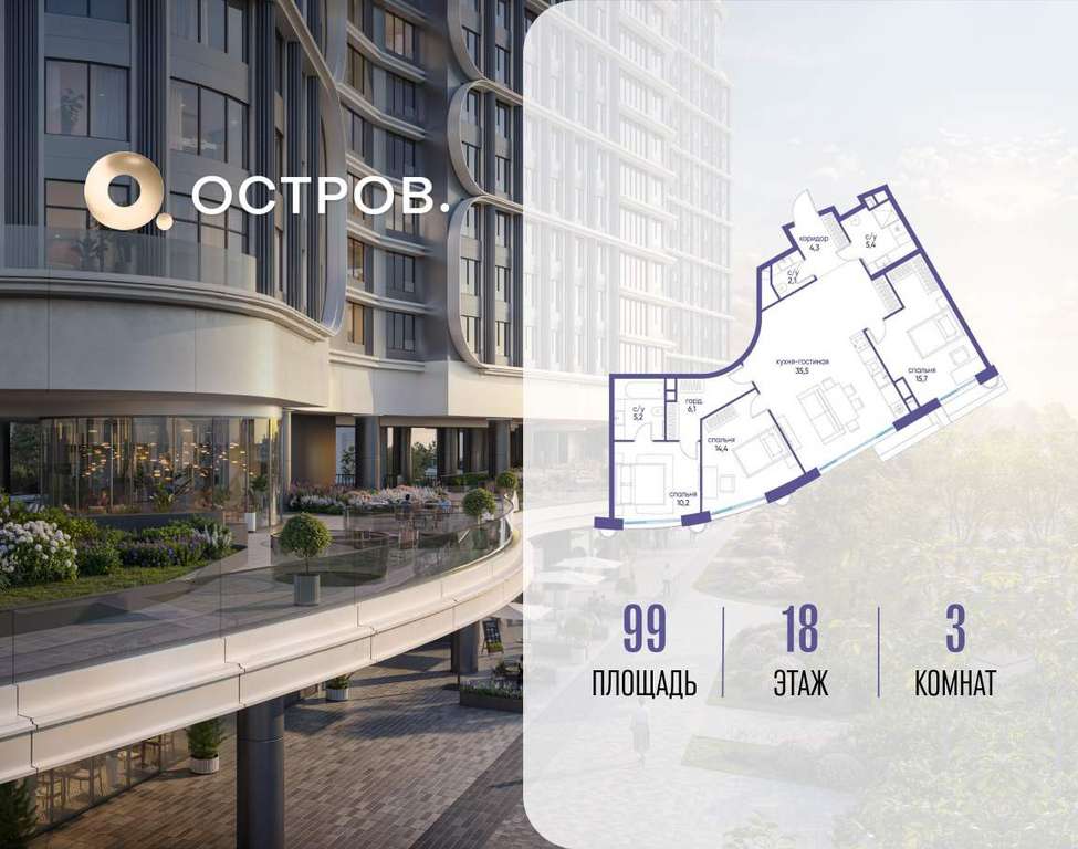 Продаётся 3-комн. квартира от застройщика: общая площадь 99.00 м, жилая 40.30 м, кухня 35.50 м, 18-й этаж, жилой квартал «Остров 7», корпус 7 (секция 2) . Срок сдачи: 3 квартал 2028 года.