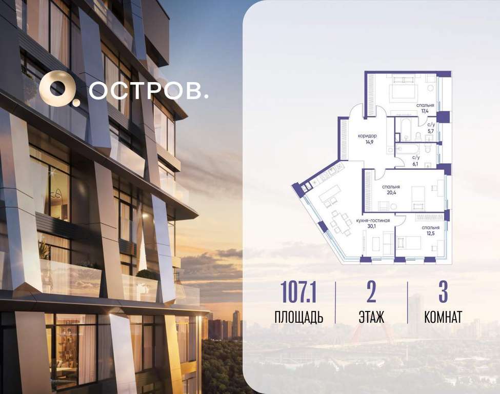 Продаётся 3-комн. квартира от застройщика: общая площадь 107.10 м, жилая 50.30 м, кухня 30.10 м, 2-й этаж, жилой квартал «Остров 12», корпус 1 (секция 1) . Срок сдачи: 1 квартал 2029 года.