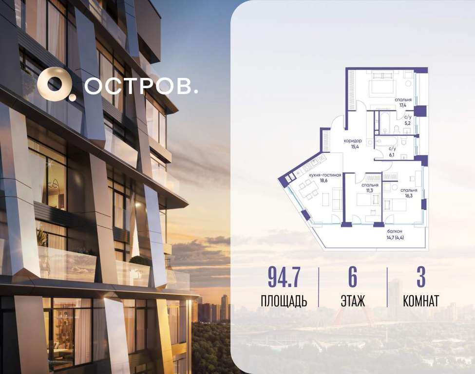 Продаётся 3-комн. квартира от застройщика: общая площадь 94.70 м, жилая 45.00 м, кухня 18.60 м, 6-й этаж, жилой квартал «Остров 12», корпус 1 (секция 1) . Срок сдачи: 1 квартал 2029 года.