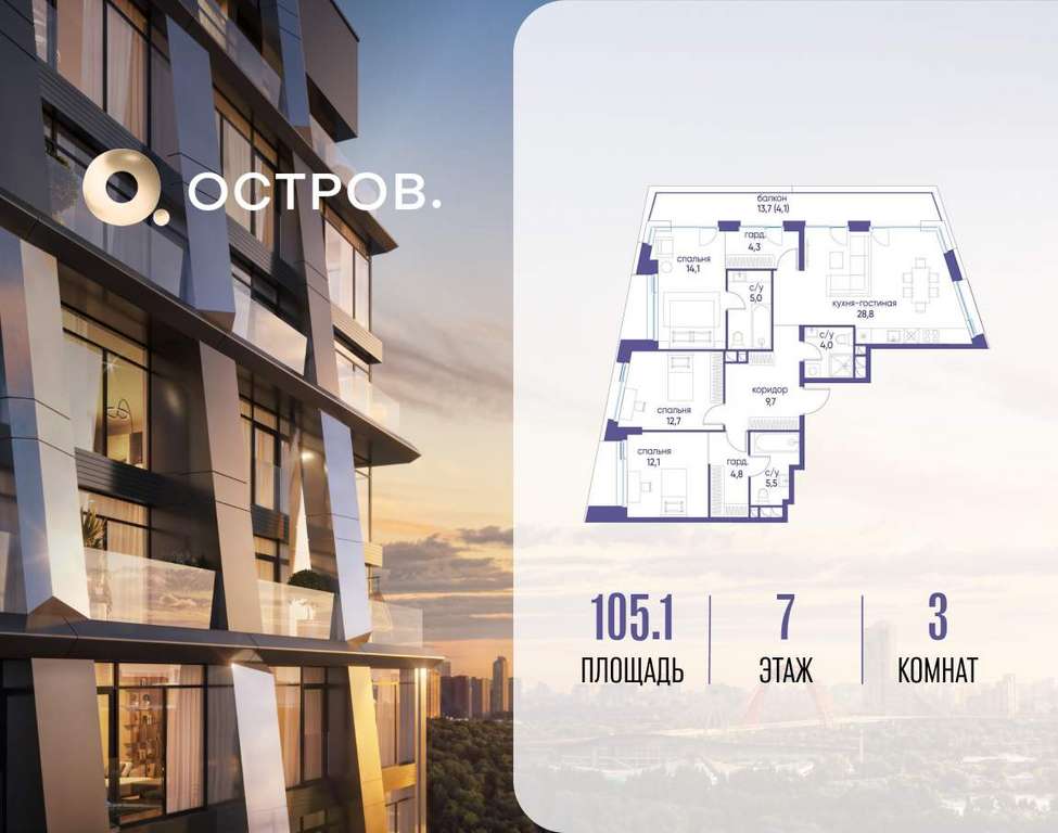 Продаётся 3-комн. квартира от застройщика: общая площадь 105.10 м, жилая 38.90 м, кухня 28.80 м, 7-й этаж, жилой квартал «Остров 12», корпус 1 (секция 2) . Срок сдачи: 1 квартал 2029 года.