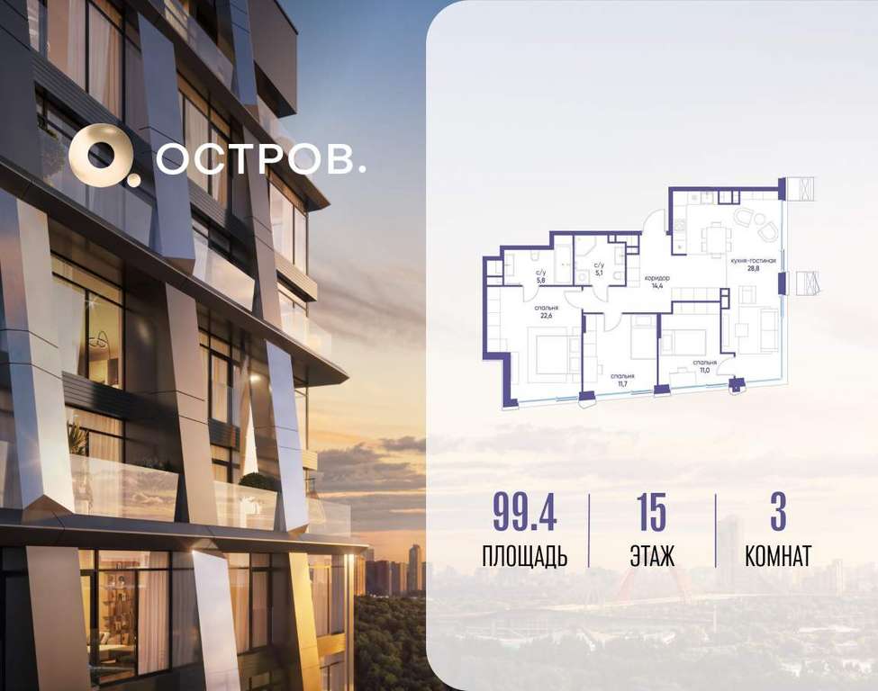 ОСТРОВ от Донстрой - жилой комплекс на западе Москвы, в Мневниковской пойме. Уникальное преимущество комплекса - в том, что он обособлен от города рекой и природным парком (650 га) . Благодаря природному окружению эта территория имеет лучший экологический рейтинг в столице. Кварталы ОСТРОВА объединены ландшафтным дизайном в единое пространство - с набережными и Центральным бульваром. На ОСТРОВЕ любые объекты, необходимые для полноценной жизни и отдыха, находятся на расстоянии 15-минутной прогулки. Торговый центр и супермаркеты, кафе и рестораны, фитнес, салоны красоты, школы и детские сады. А также крупнейший в Москве спортивный кластер.