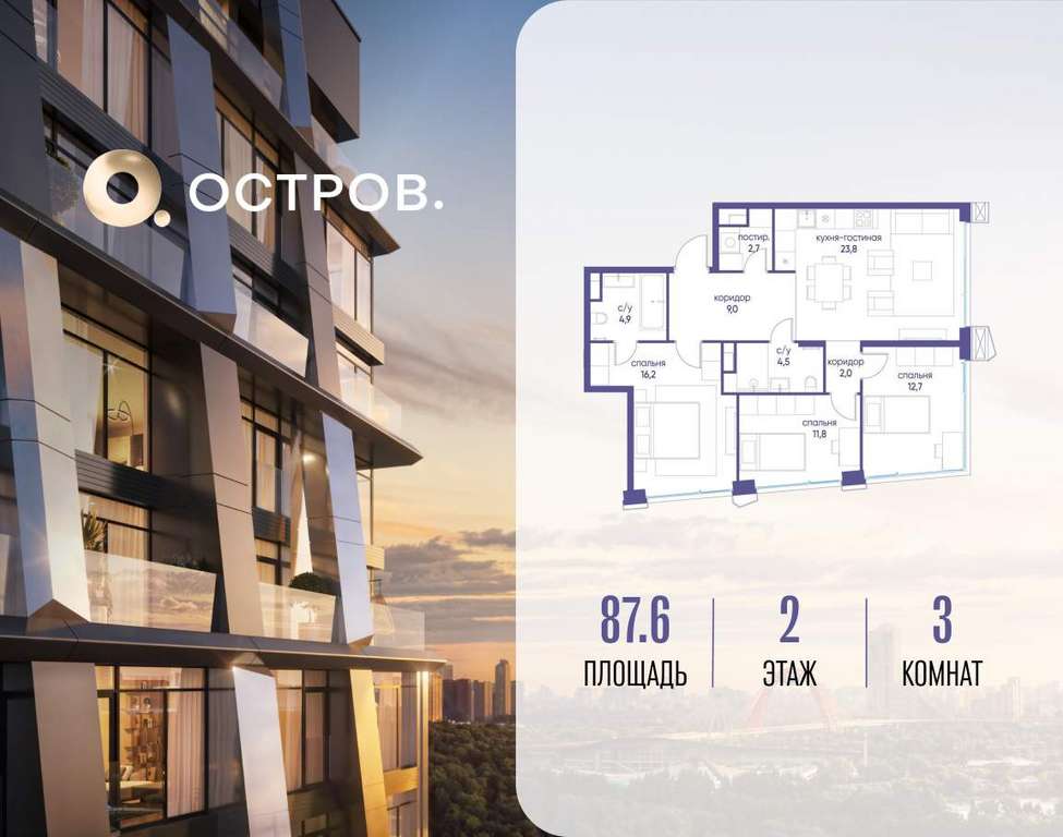 Продаётся 3-комн. квартира от застройщика: общая площадь 87.60 м, жилая 40.70 м, кухня 23.80 м, 2-й этаж, жилой квартал «Остров 12», корпус 2 (секция 1) . Срок сдачи: 1 квартал 2029 года.