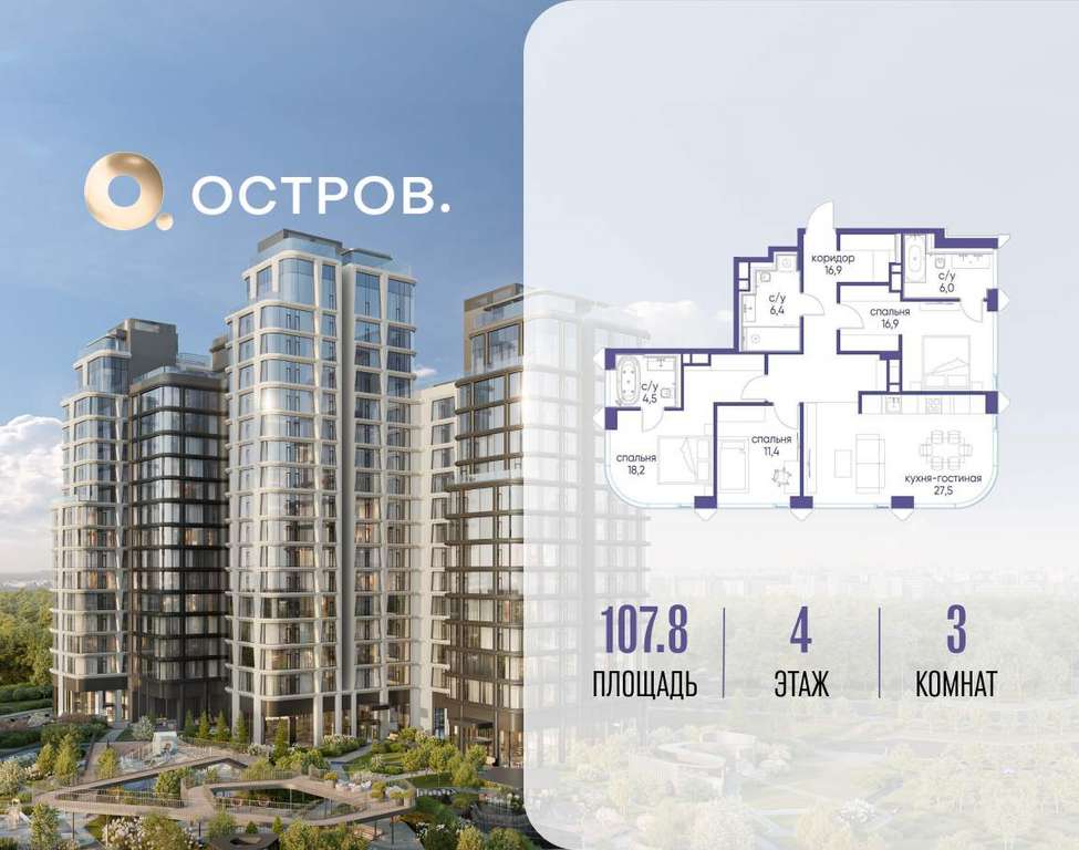 Продаётся 3-комн. квартира от застройщика: общая площадь 107.80 м, жилая 46.50 м, кухня 27.50 м, 4-й этаж, жилой квартал «Остров 12», корпус 2 (секция 2) . Срок сдачи: 1 квартал 2029 года.
