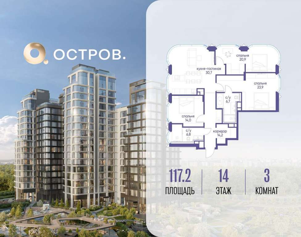 Продаётся 3-комн. квартира от застройщика: общая площадь 117.20 м, жилая 58.80 м, кухня 30.70 м, 14-й этаж, жилой квартал «Остров 12», корпус 2 (секция 1) . Срок сдачи: 1 квартал 2029 года.