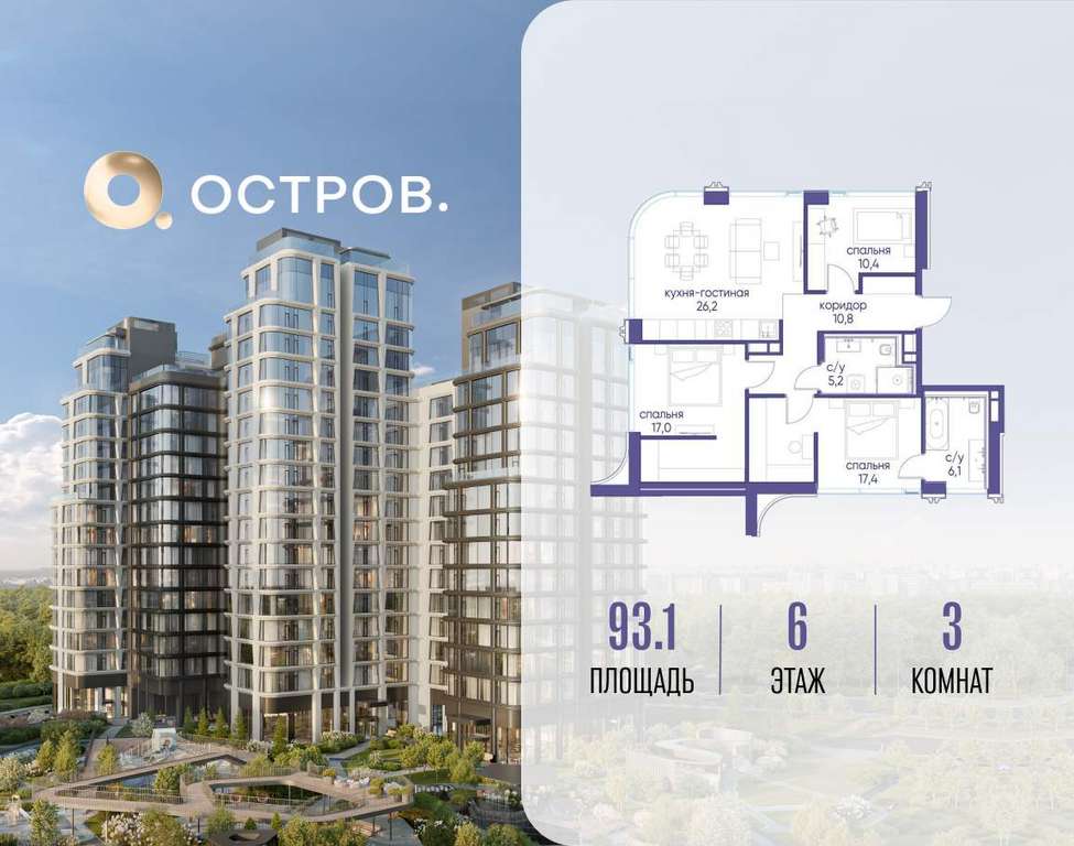 Продаётся 3-комн. квартира от застройщика: общая площадь 93.10 м, жилая 44.80 м, кухня 26.20 м, 6-й этаж, жилой квартал «Остров 12», корпус 2 (секция 2) . Срок сдачи: 1 квартал 2029 года.