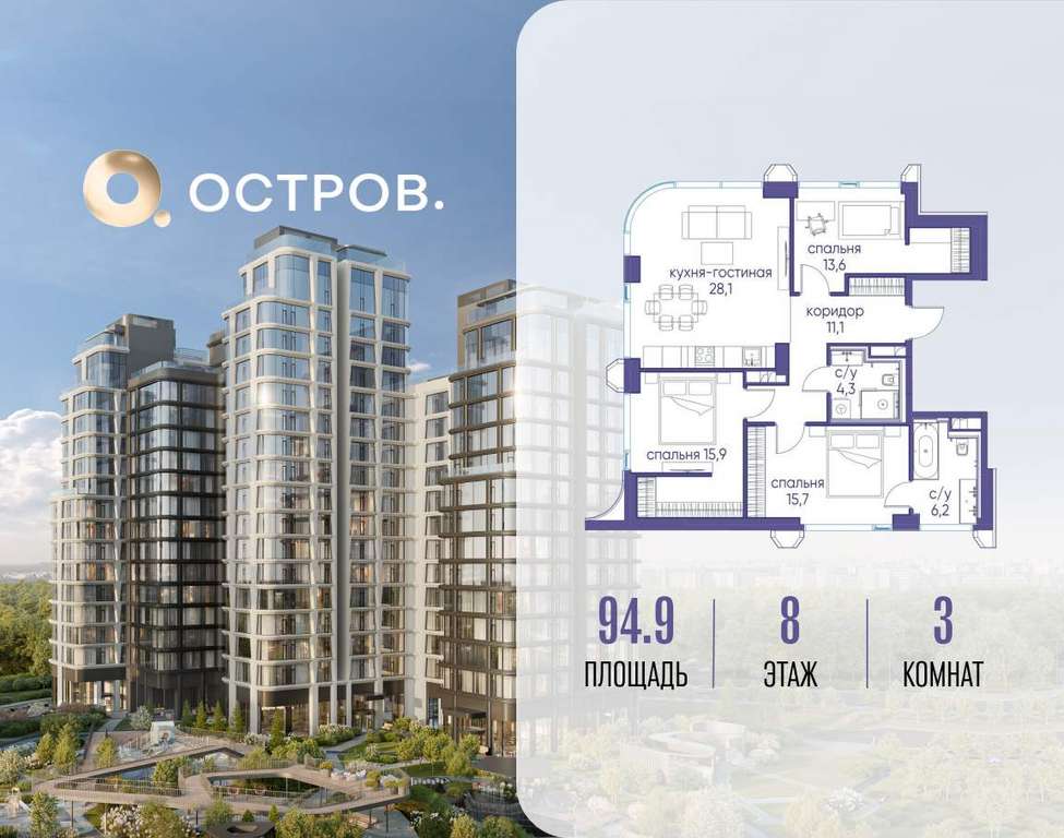 Продаётся 3-комн. квартира от застройщика: общая площадь 94.90 м, жилая 45.20 м, кухня 28.10 м, 8-й этаж, жилой квартал «Остров 12», корпус 1 (секция 3) . Срок сдачи: 1 квартал 2029 года.