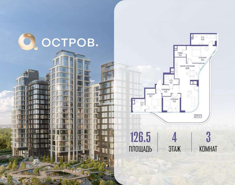 Продаётся 3-комн. квартира от застройщика: общая площадь 126.50 м, жилая 41.10 м, кухня 38.80 м, 4-й этаж, жилой квартал «Остров 12», корпус 6 (секция 1) . Срок сдачи: 1 квартал 2029 года.