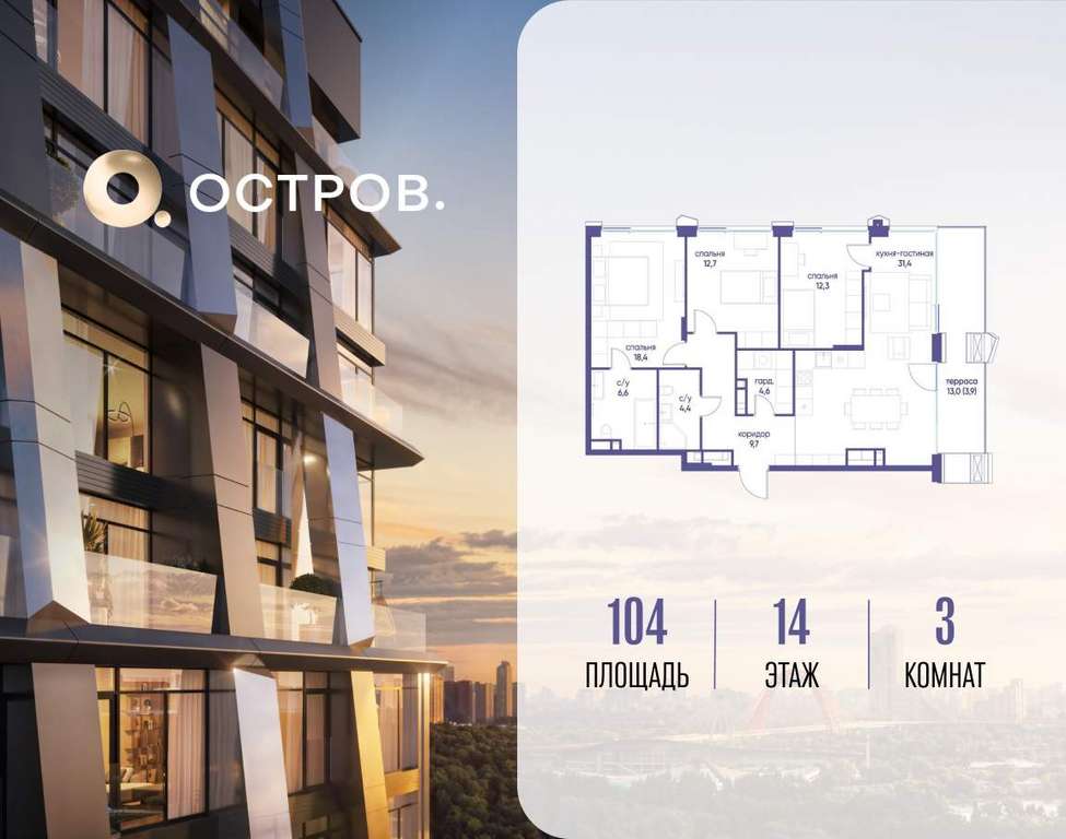 Продаётся 3-комн. квартира от застройщика: общая площадь 104.00 м, жилая 43.40 м, кухня 31.40 м, 14-й этаж, жилой квартал «Остров 12», корпус 2 (секция 1) . Срок сдачи: 1 квартал 2029 года.