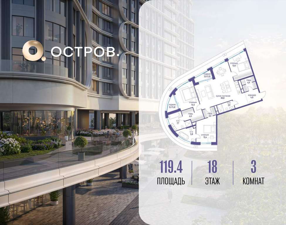 Продаётся 3-комн. квартира от застройщика: общая площадь 119.40 м, жилая 40.90 м, кухня 38.80 м, 18-й этаж, жилой квартал «Остров 7», корпус 6 (секция 2) . Срок сдачи: 3 квартал 2028 года.