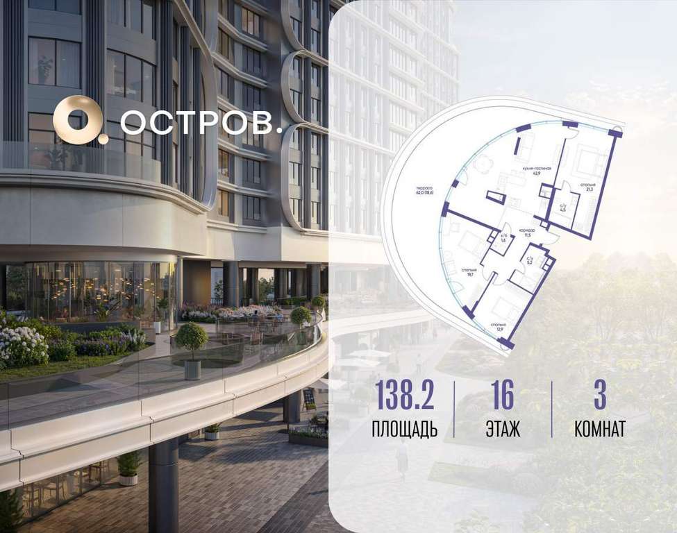 ОСТРОВ от Донстрой - жилой комплекс на западе Москвы, в Мневниковской пойме. Уникальное преимущество комплекса - в том, что он обособлен от города рекой и природным парком (650 га) . Благодаря природному окружению эта территория имеет лучший экологический рейтинг в столице. Кварталы ОСТРОВА объединены ландшафтным дизайном в единое пространство - с набережными и Центральным бульваром. На ОСТРОВЕ любые объекты, необходимые для полноценной жизни и отдыха, находятся на расстоянии 15-минутной прогулки. Торговый центр и супермаркеты, кафе и рестораны, фитнес, салоны красоты, школы и детские сады. А также крупнейший в Москве спортивный кластер.