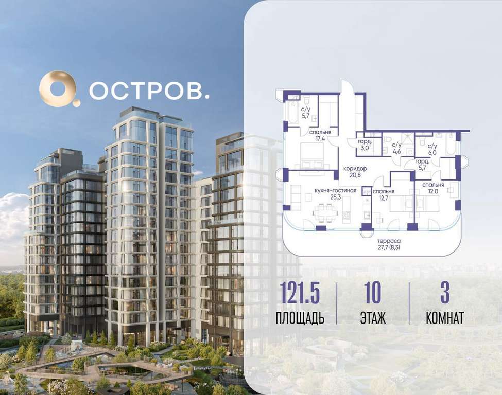 Продаётся 3-комн. квартира от застройщика: общая площадь 121.50 м, жилая 42.10 м, кухня 25.30 м, 10-й этаж, жилой квартал «Остров 12», корпус 1 (секция 1) . Срок сдачи: 1 квартал 2029 года.