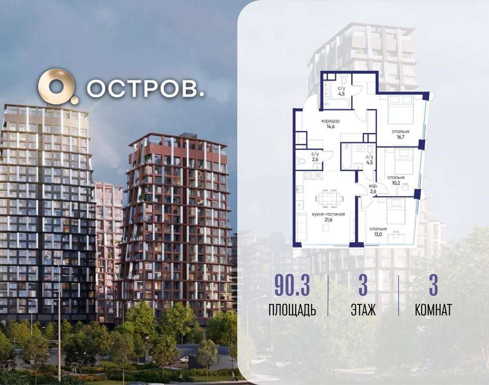 Продаётся 3-комн. квартира от застройщика: общая площадь 90.30 м, жилая 39.90 м, кухня 21.60 м, 3-й этаж, жилой квартал «Остров 14», корпус 6 (секция 1) . Срок сдачи: 2 квартал 2029 года.