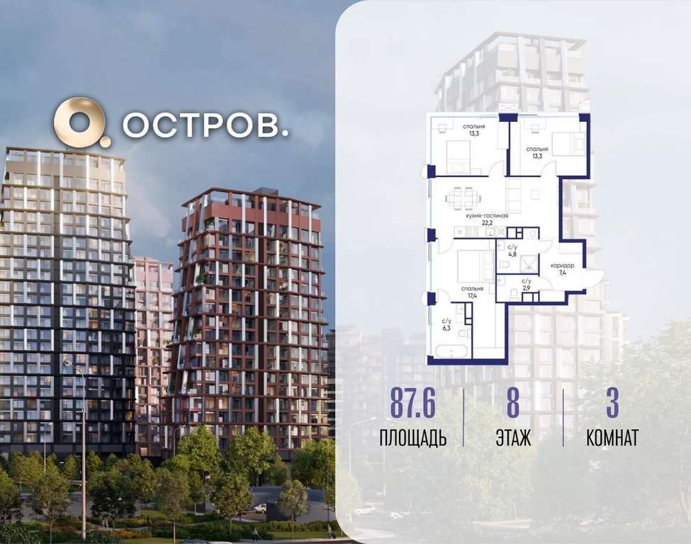 Продаётся 3-комн. квартира от застройщика: общая площадь 87.60 м, жилая 44.00 м, кухня 22.20 м, 8-й этаж, жилой квартал «Остров 14», корпус 6 (секция 1) . Срок сдачи: 2 квартал 2029 года.