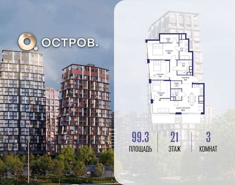 Продаётся 3-комн. квартира от застройщика: общая площадь 99.30 м, жилая 40.70 м, кухня 28.60 м, 21-й этаж, жилой квартал «Остров 14», корпус 4 (секция 1) . Срок сдачи: 2 квартал 2029 года.