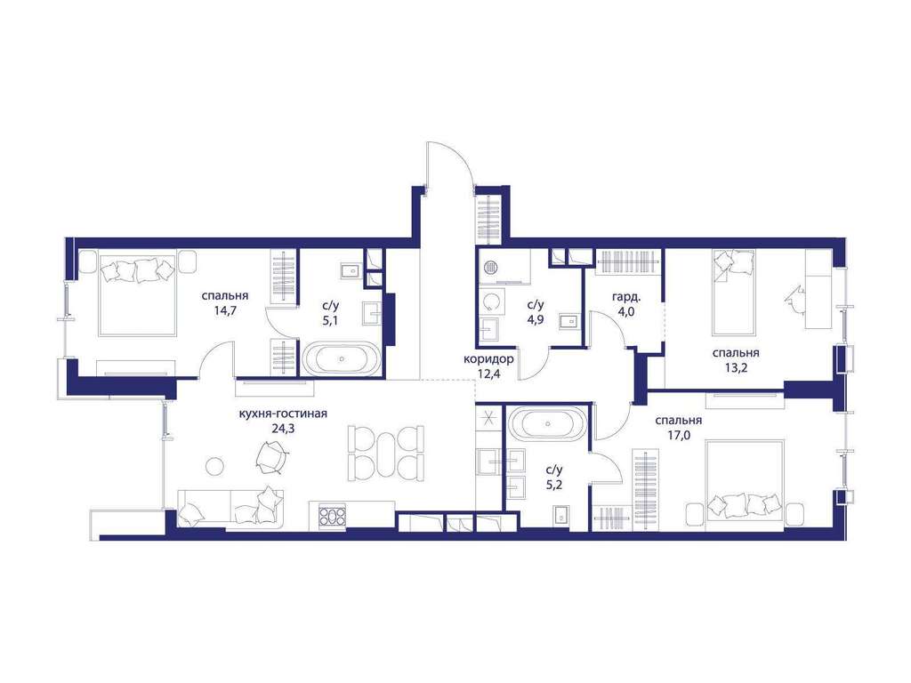 Продаётся 3-комнатная квартира от застройщика: общая площадь 100.80 м, жилая 44.90 м, кухня 24.30 м, 6-й этаж, жилой квартал «Событие-6», корпус 1 (секция 1) Срок сдачи: 4 квартал 2029 года.