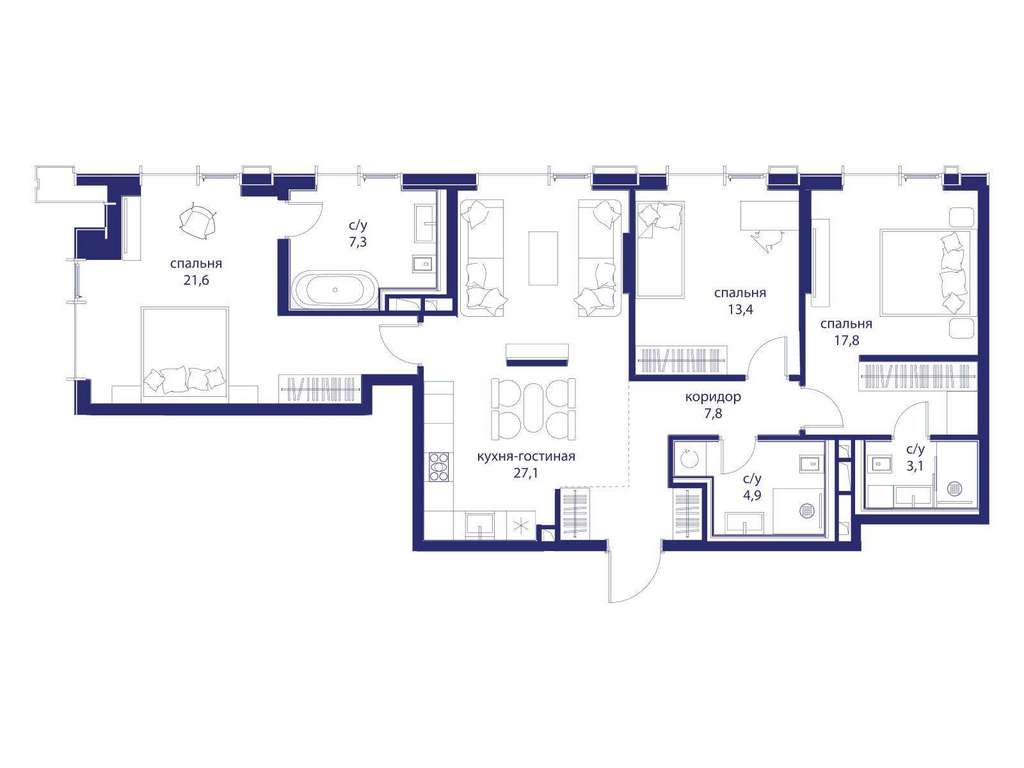 Продаётся 3-комнатная квартира от застройщика: общая площадь 103.00 м, жилая 52.80 м, кухня 27.10 м, 2-й этаж, жилой квартал «Событие-6», корпус 1 (секция 3) Срок сдачи: 4 квартал 2029 года.