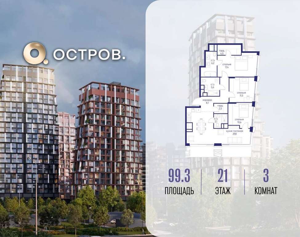 Продаётся 3-комн. квартира от застройщика: общая площадь 99.30 м, жилая 39.50 м, кухня 29.80 м, 21-й этаж, жилой квартал «Остров 14», корпус 6 (секция 1) . Срок сдачи: 2 квартал 2029 года.